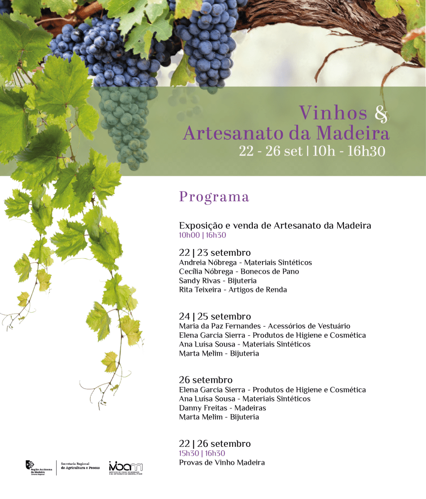 O Instituto do Vinho, do Bordado e do Artesanato da Madeira (IVBAM) promove a segunda edição da semana temática “Vinhos e Artesanato da Madeira”, de 22 a 26 de setembro, nas suas instalações da Rua dos Ferreiros, 152, Funchal. Entrada livre!